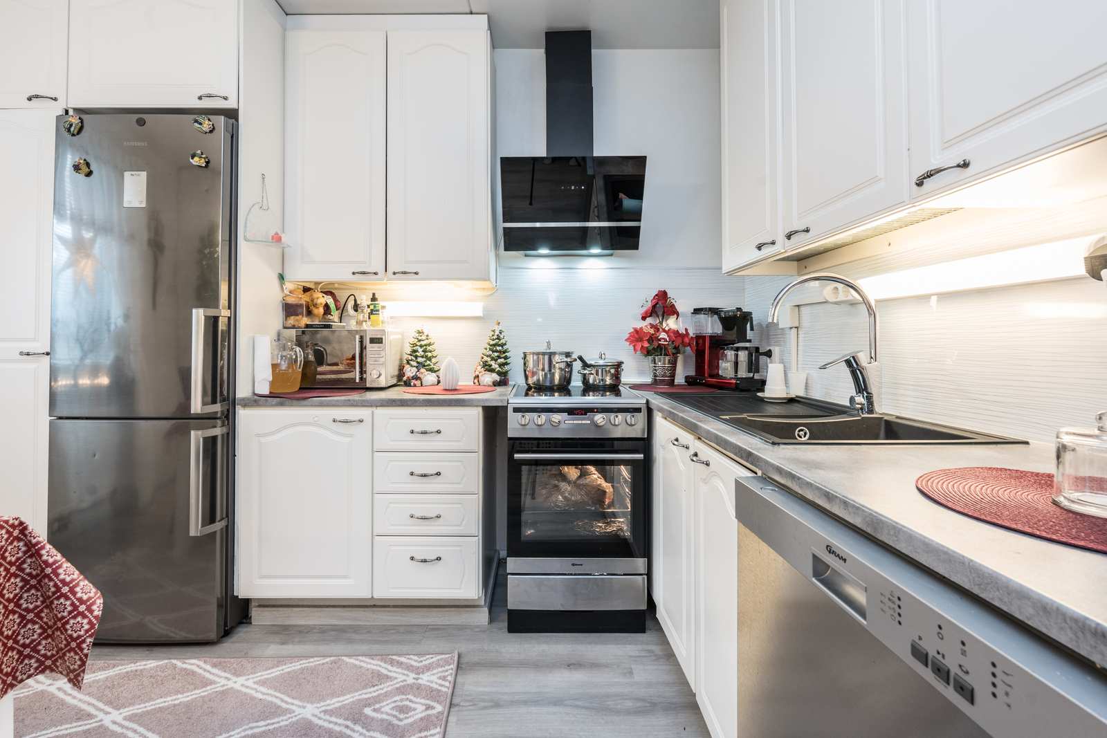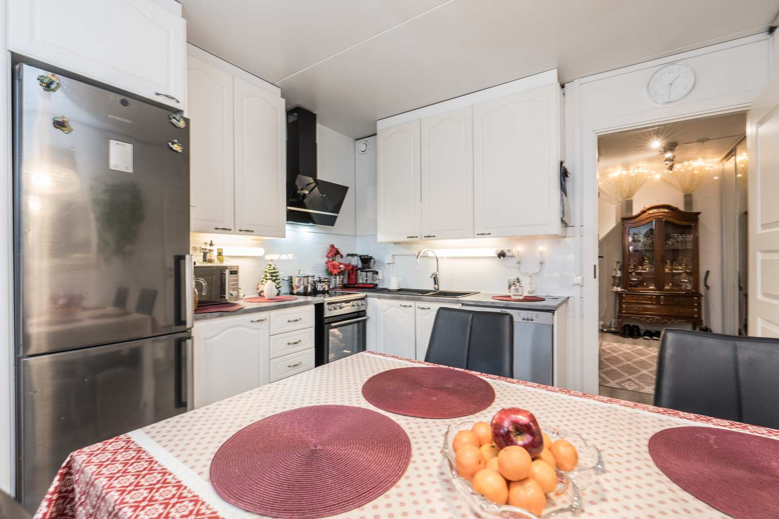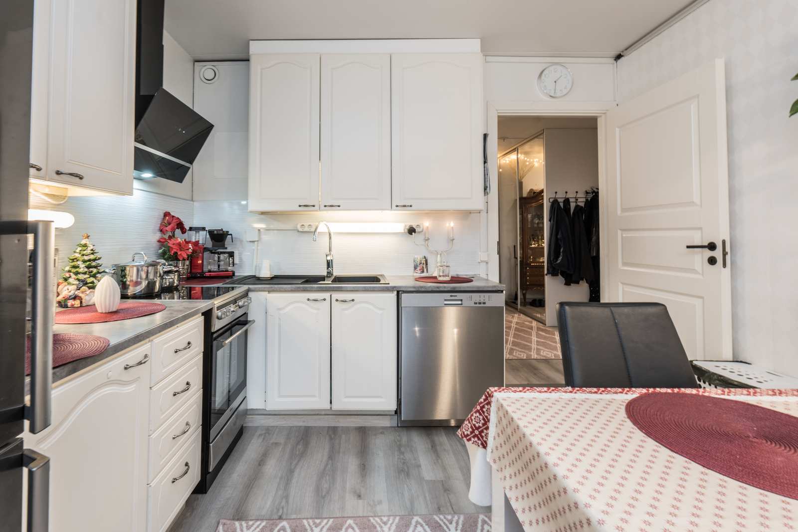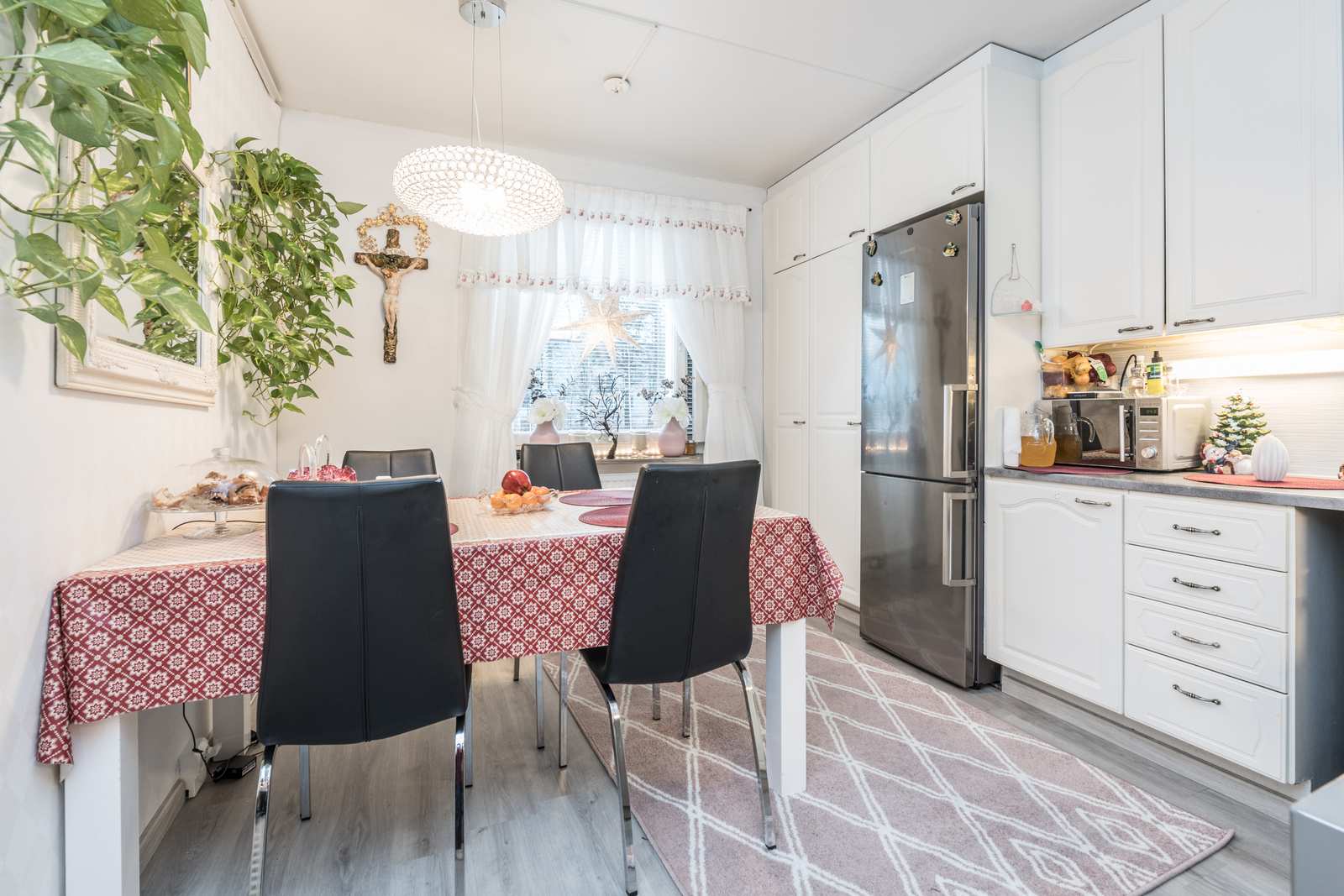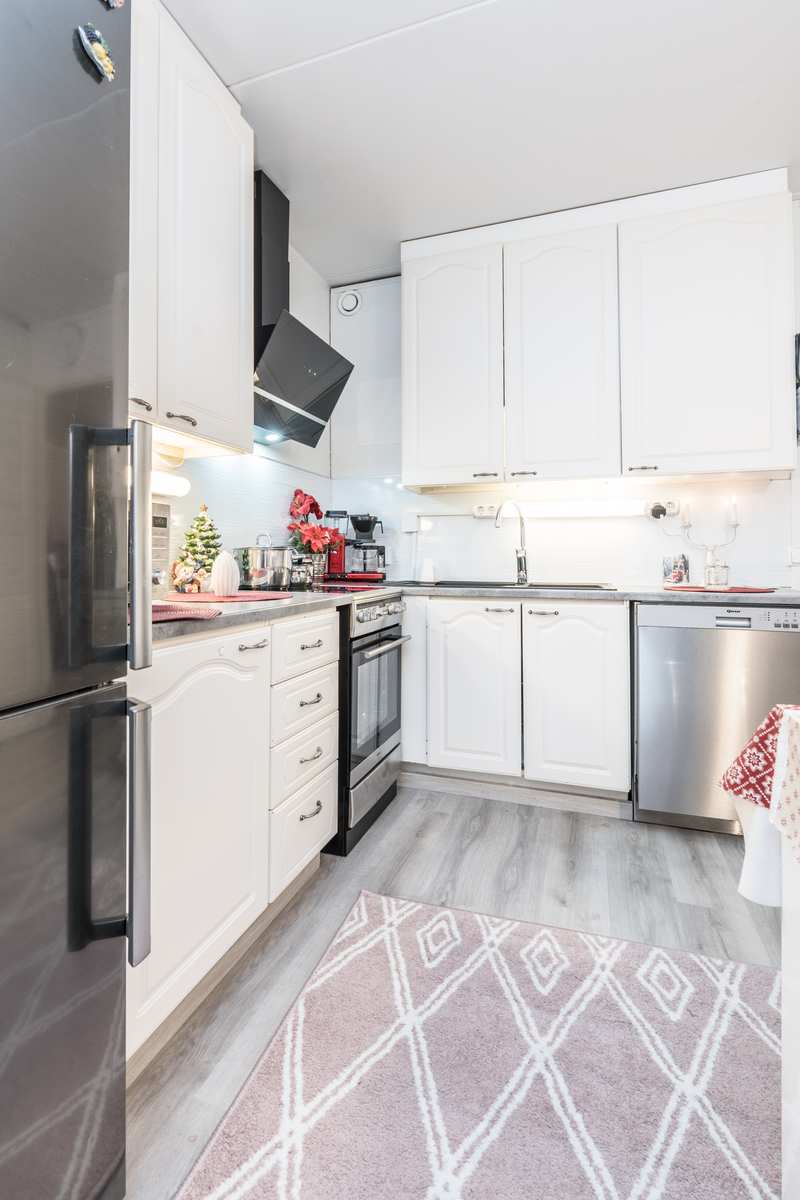 | Keittiön varustus | Jääkaappi ja pakastin: jääkaappi/pakastin Muut varusteet: liesituuletin, astianpesukone Tasot: laminaatti Lattia: vinyyli Liesi/uuni: sähköliesi |