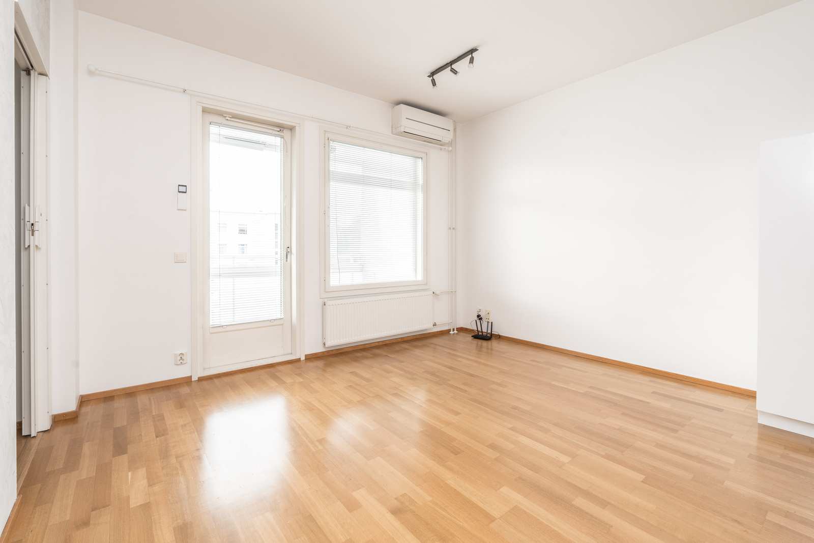 Olohuone | Olohuoneesta käynti tilavalle lasitetulle parvekkeelle, jossa infrapunalämmitin. Lattia: parketti |