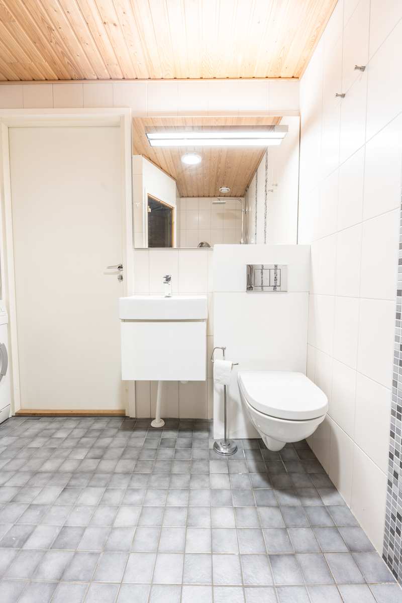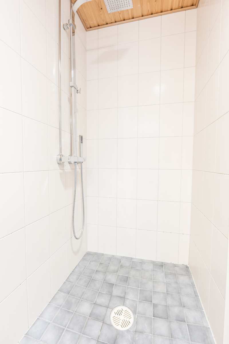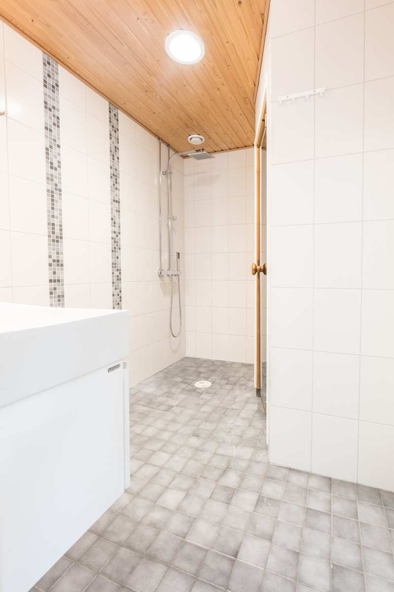 Kylpyhuone | Varusteet: kuivausrumpu, pesukoneliitäntä, lattialämmitys, wc-istuin, suihku, peilikaappi, kiinteät valaisimet Seinät: kaakeli Lattia: laatta |