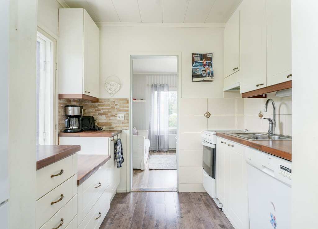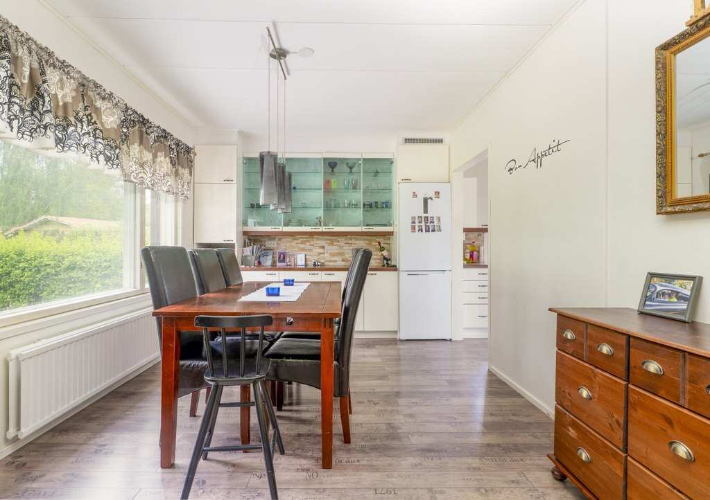 Keittiön varustus | Jääkaappi ja pakastin: jääkaappi/pakastin Tasot: laminaatti Seinät: maalattu Lattia: laminaatti Muut varusteet: astianpesukone, kiinteät valaisimet, liesituuletin / hormi Liesi/uuni: keraaminen |