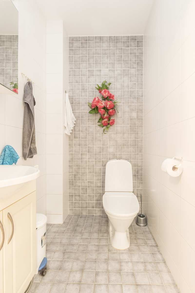 | Kylpyhuone | Varusteet: lattialämmitys, wc-istuin, suihku, kiinteät valaisimet Seinät: kaakeli Lattia: laatta |