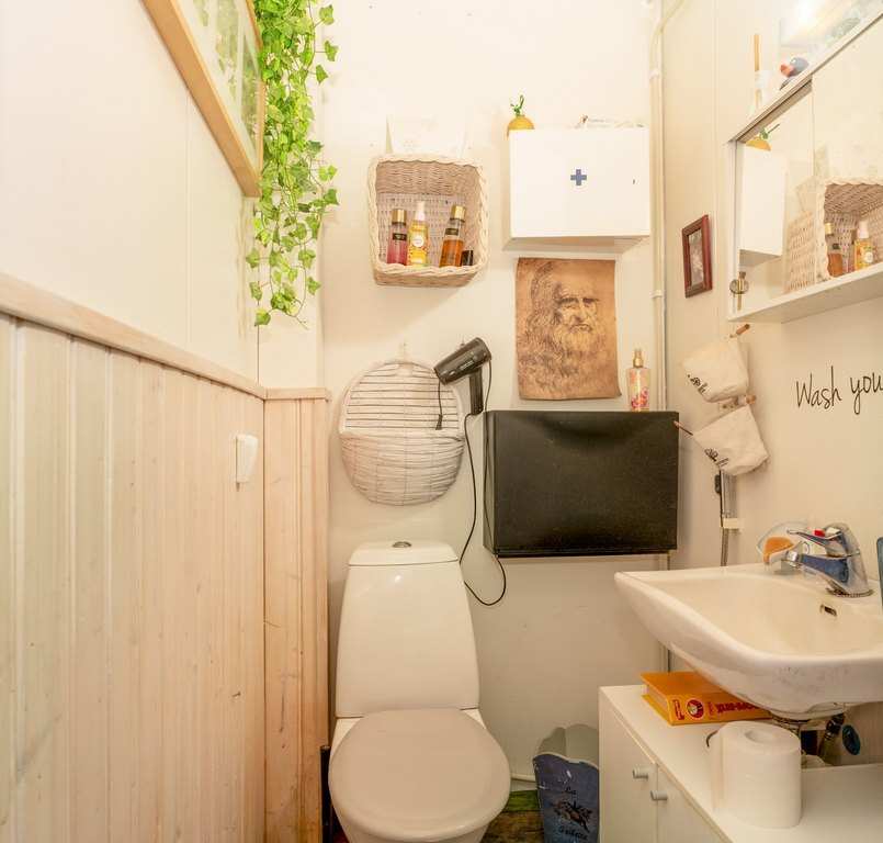 Erillinen WC | Lattia: muovi Varusteet: peilikaappi, bidee-suihku Seinät: maalattu, puolipaneeli Lukumäärä: 1 |