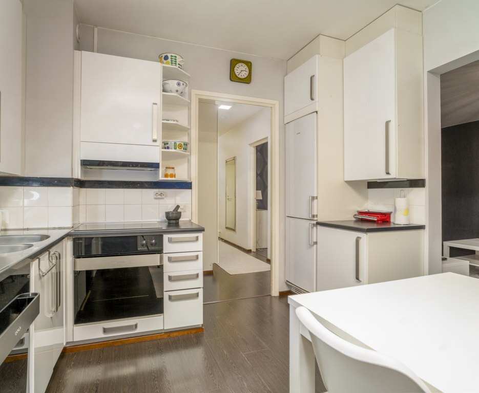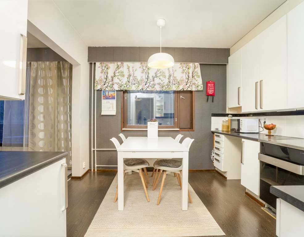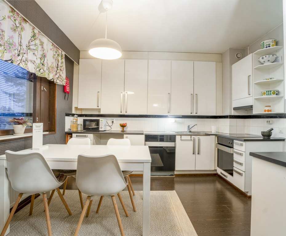 | Keittiön varustus | Jääkaappi ja pakastin: jääkaappi/pakastin Tasot: laminaatti Seinät: maalattu, tapetti Lattia: laminaatti Muut varusteet: astianpesukone, kiinteät valaisimet, liesituuletin / hormi Liesi/uuni: erillisuuni, liesitaso |