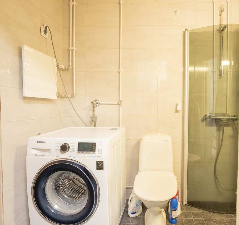| Kylpyhuone | Varusteet: suihkuseinä, pesukoneliitäntä, wc-istuin, suihku, peilikaappi, kiinteät valaisimet, kylpyhuonekaapisto Seinät: kaakeli Lattia: laatta |